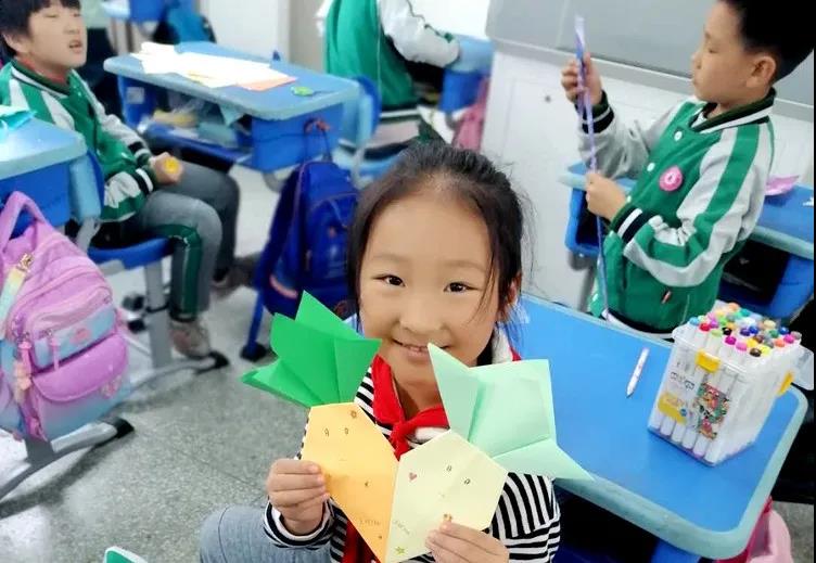 203班王梓琳同學(xué),通過折、剪、拼,做出了大大的胡蘿卜,告訴大家多吃蔬菜身體好